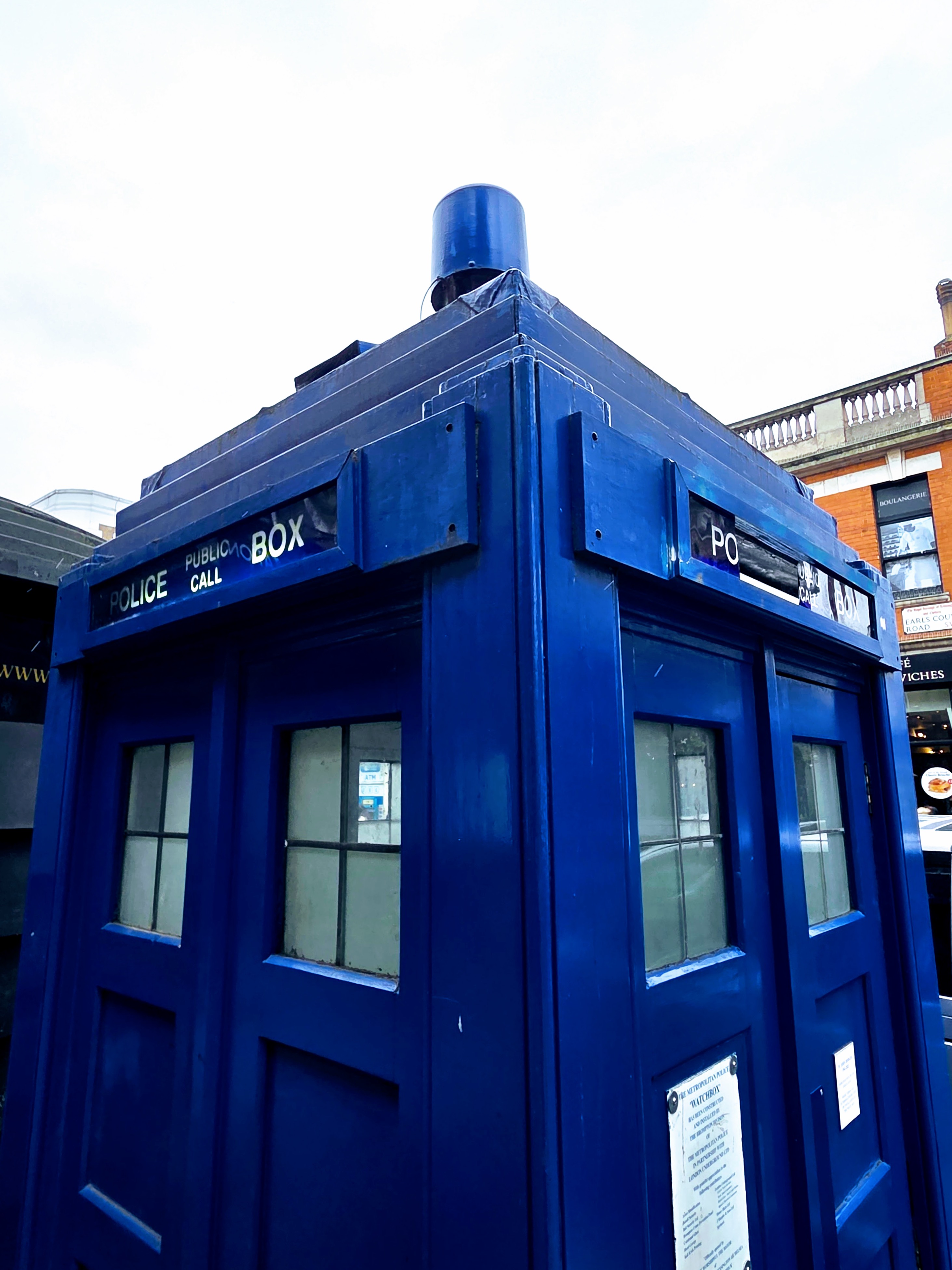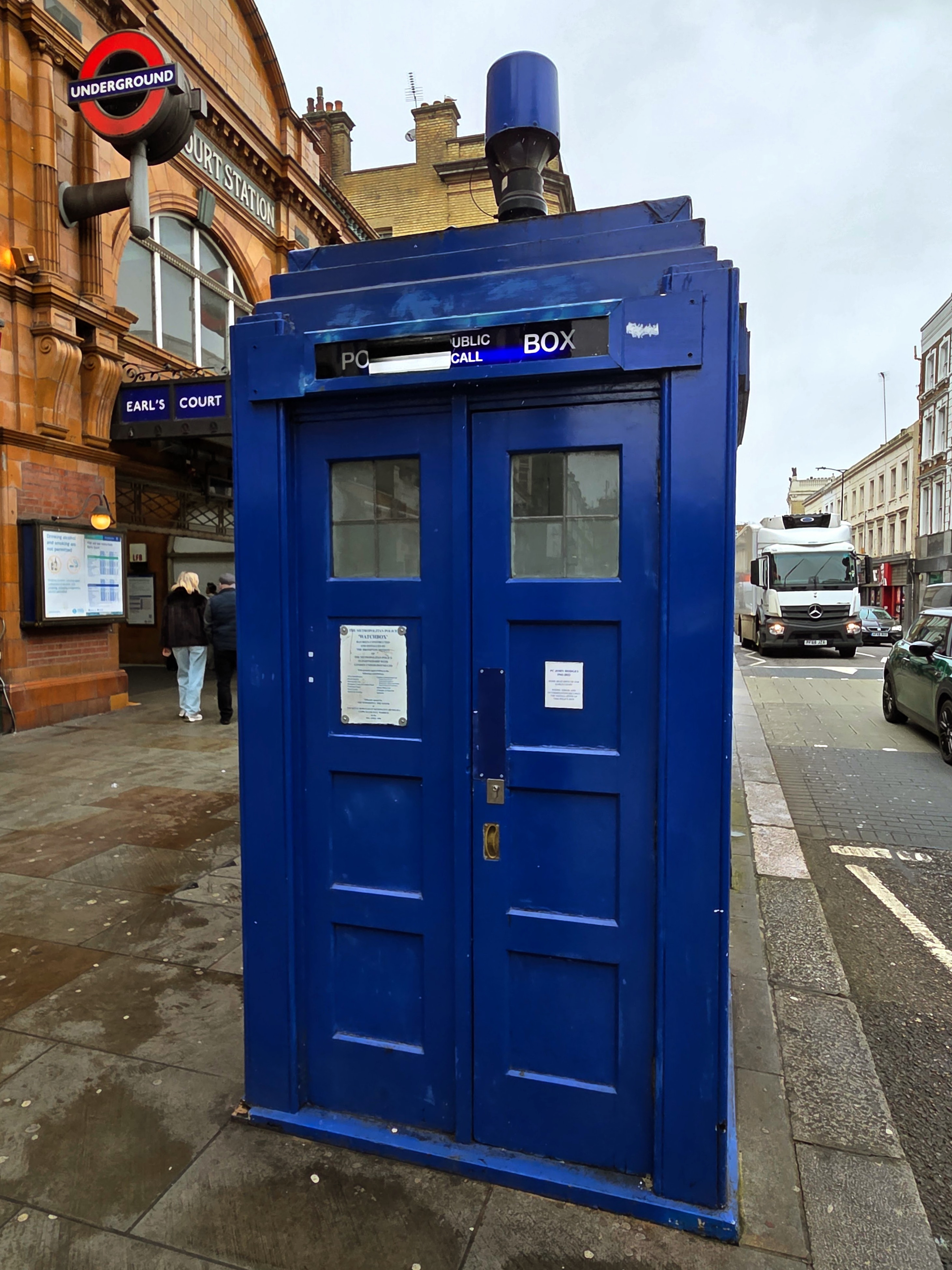 Olympia isn’t too far from Earl’s Court, so I of course had to get a photo of the police box there. I was sad to see part of the sign above the doors has been damaged since my last visit! 😦