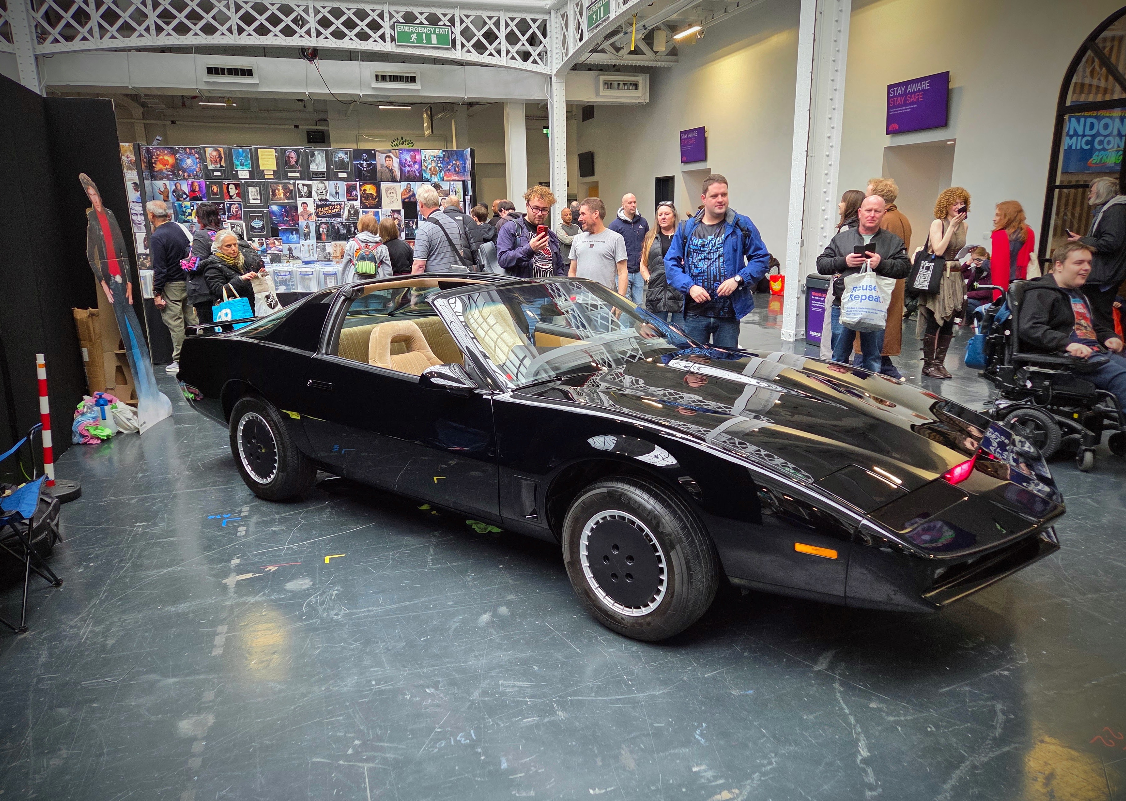 How nice to be greeted by Kitt from Knight Rider when I entered! Tony was telling me the guy who built this version (it’s not the original from the TV show) has used AI so the car can actually communicate back with you. It’s like TV come to life! The other photo shows a view of the event floor from the second level. Lots of stuff to buy!