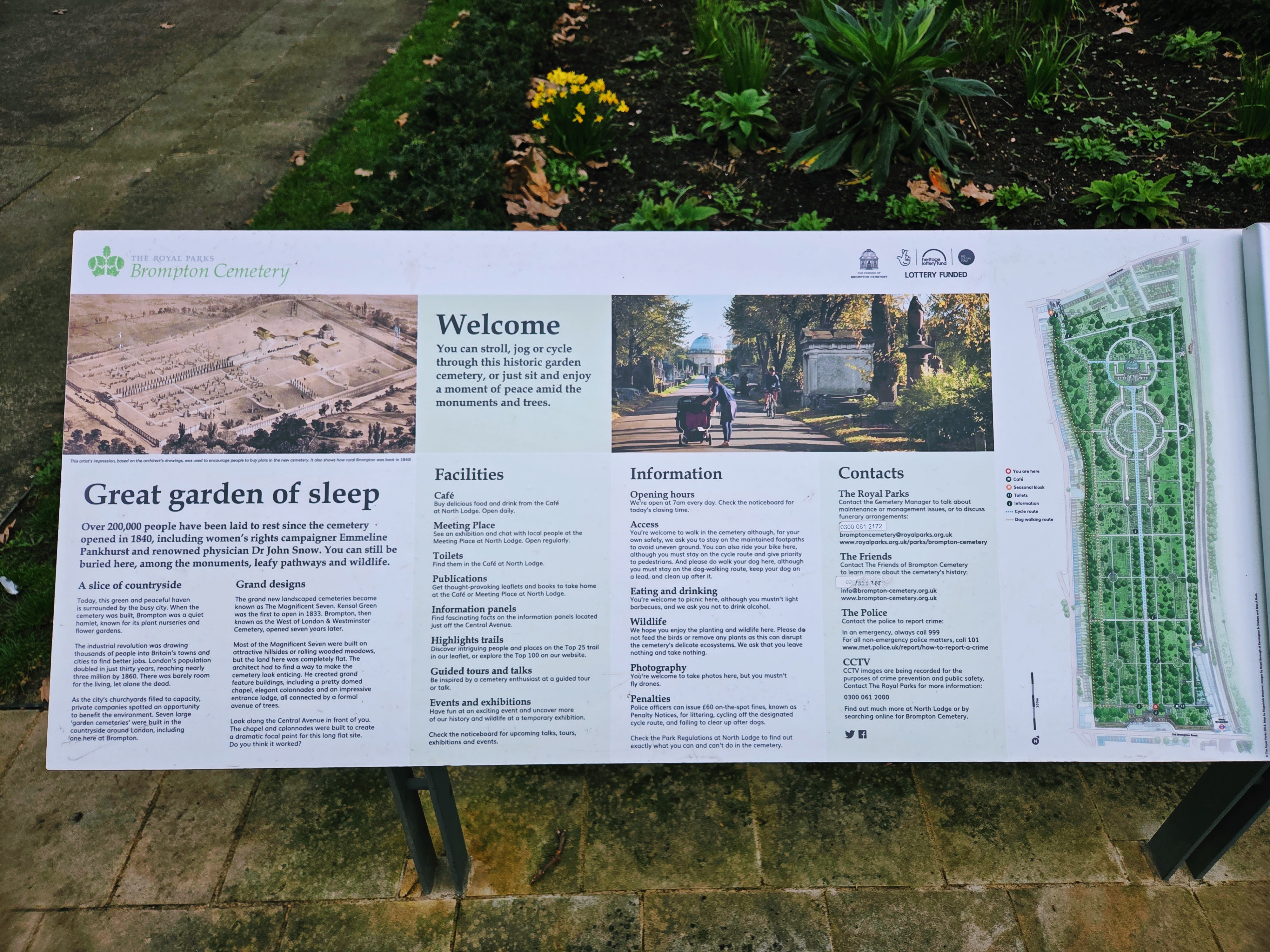 Enter Brompton Cemetery (and others) to help alleviate the problem, at least to some extent. It was originally started by a private company, but as often happens, that company ran out of money, so ownership then transferred to the borough of Kensington and Chelsea, who didn’t do the best job of taking care of it. Today, it’s owned by the Crown, but doesn’t get any money from them for maintenance or upkeep, so the money brought in via tours like the one I went on are is critical in caring for the grounds. It did receive a National Lottery grant in 2014, which helped to make some notable improvements, including building a cafe and information center and to repair/shore up a number of cemetery monuments that were falling apart and tagged as unsafe to be near.