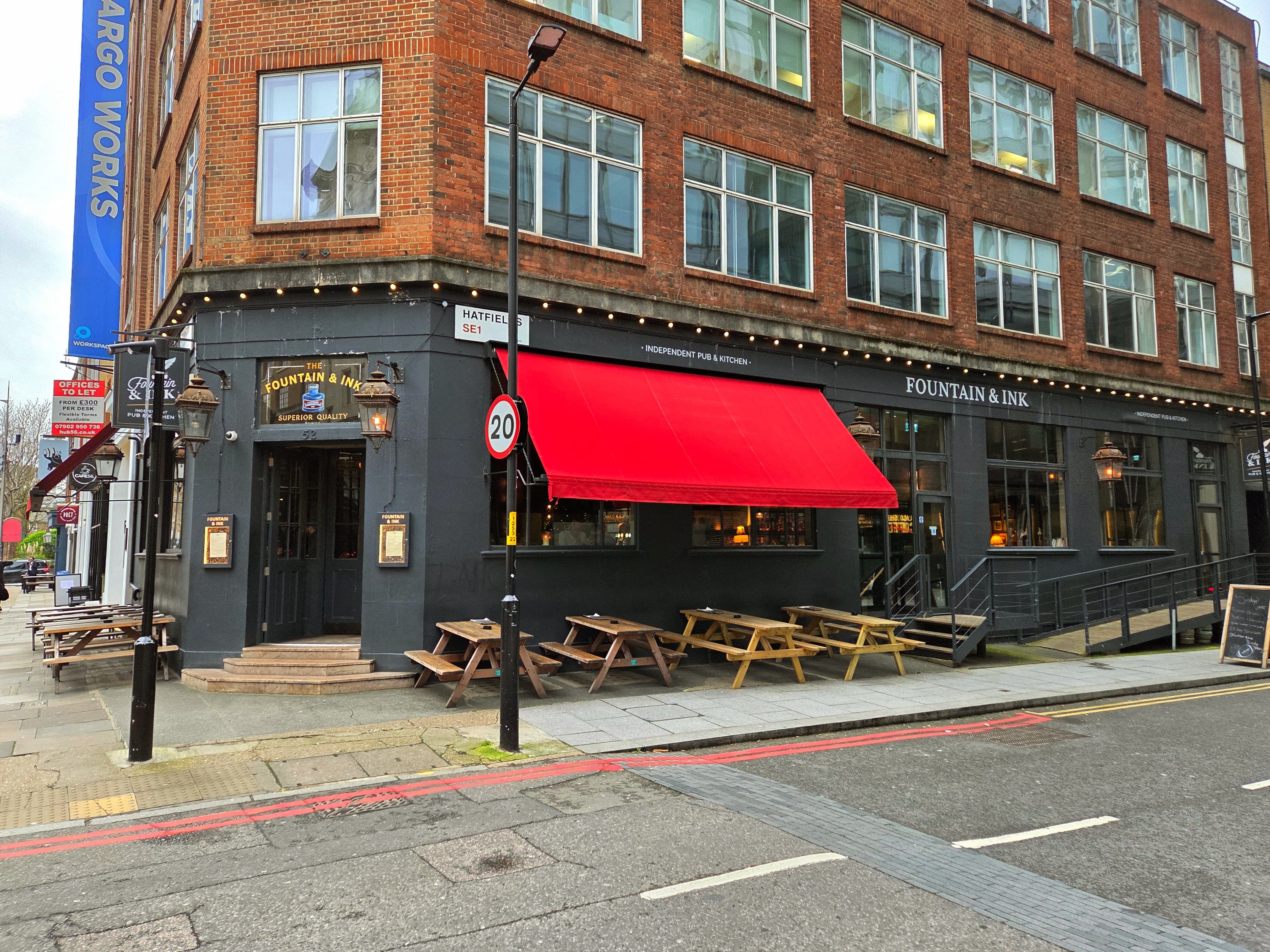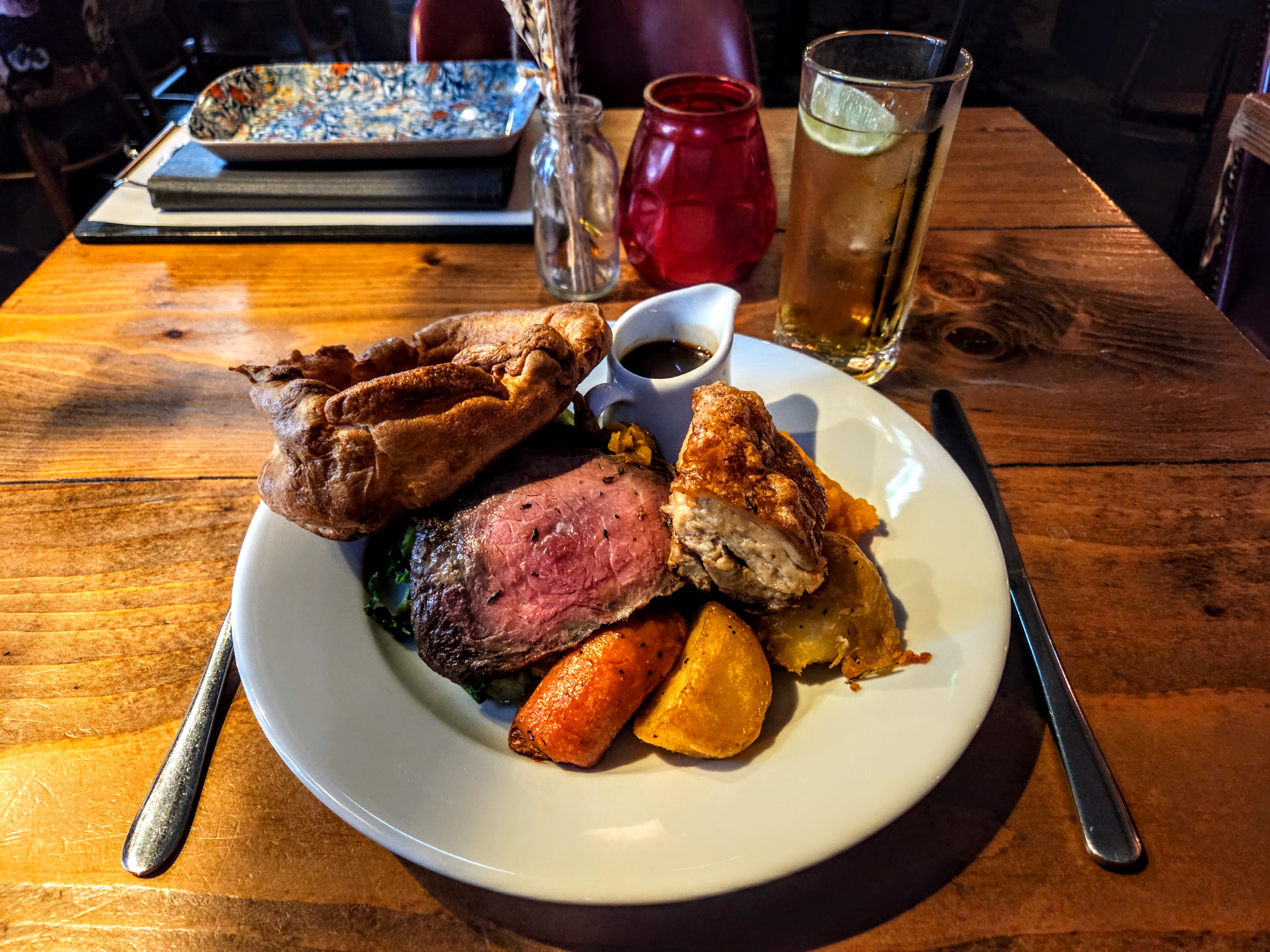 What a good tour that was! Between the tour and my journey to the convention though, I had a lot of steps on my feet by this point and was ready to catch the tube somewhere where I could sit down, rest my feet, and have a meal. Even though I already ate at a pub on this trip, I walked by a neat-looking pub, The Fountain & Ink, a couple of days ago and noticed that it wasn’t part of the big pub chains here (Greene King, Fuller’s, etc.) and that made me want to visit because it’s seems so hard to find pubs like that. I decided to head that way for a Sunday roast late lunch/early dinner and I’m glad I did because it was really tasty! Although I toyed with the idea of getting something else, I ultimately REALLY enjoyed the Chef’s Roast, which included beef, chicken, pork, along with some tasty vegetables and a Yorkshire pudding. And I even had a scoop of ice cream for dessert. After all those steps, I earned it! 🙂